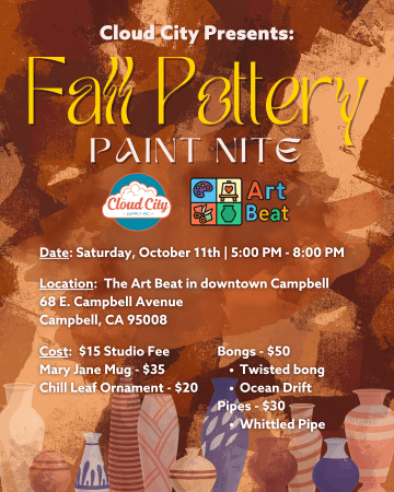 Join us for a cozy and creative night out in Campbell! Cloud City Supply and The Art Beat are teaming up for a special Fall Pottery Paint Nite where you’ll get to paint your own one-of-a-kind piece.