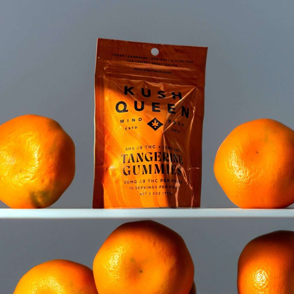 Elevate your mind and body with Kush Queen Tangerine Delta 9 THC + CBD Gummies.