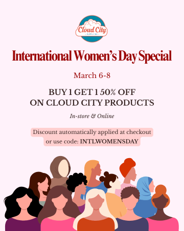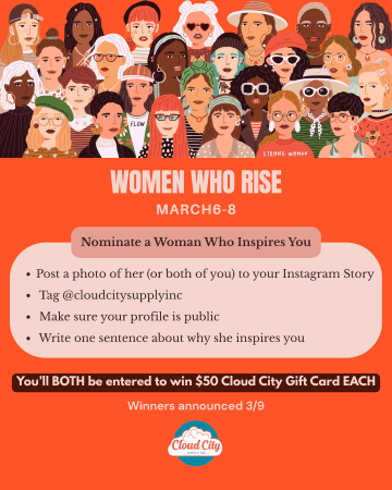 From 3/6–3/8, nominate a woman who inspires you by posting to your Instagram Story, tagging @cloudcitysupplyinc, and keeping your profile public. Include one sentence about why she inspires you. You and your nominee will be entered to win a $50 gift card each. Winners announced 3/9.